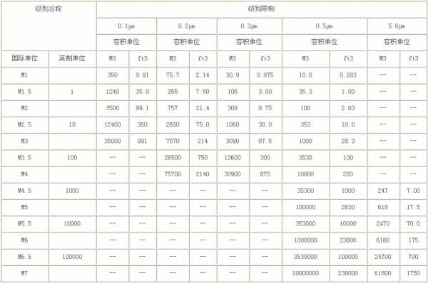 根據(jù)中華人民共和國國家標準GB 50073-2001(GBJ73—84 已作廢),《潔凈廠房設(shè)計規(guī)范》(下面簡稱《規(guī)范》)明確規(guī)定了空氣潔凈度的四個等級(潔凈度即指潔凈環(huán)境中空氣含塵粒多少的程度),并制作了相應(yīng)表格以示劃分之標準: