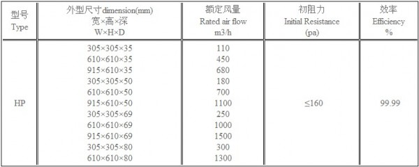 HP超薄式無隔板高效過濾器型號(hào)尺寸及其它參數(shù):