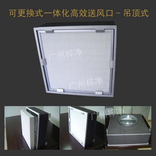 可更換式一體化高效送風口:由靜壓箱和無隔板高效過濾器組成,采用鋁型材做靜壓箱,箱體內置無隔板高效過濾器。該送風口具有通風性強、外形美觀、安裝更換方便、維護簡單、投資少、重量輕、厚度薄、過濾效率高等優點。