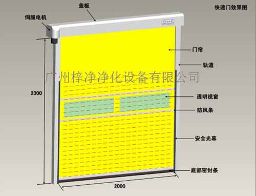 快速卷簾門是以多關(guān)節(jié)活動的門片串聯(lián)在一起,在風(fēng)淋室固定的滑道內(nèi),以門上方卷軸為中心轉(zhuǎn)動上下的門。卷簾門同風(fēng)淋室箱體的作用一樣起到水平分隔,它由簾板、座板、導(dǎo)軌 、支座、卷軸、箱體、控制箱、卷門機(jī)、限位器、門楣、手動速放開關(guān)裝置、按鈕開關(guān)和保險(xiǎn)裝置等13個部分組成。