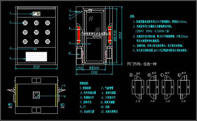 9、進門(由外——內(nèi)走):打開風(fēng)淋室進門方向,內(nèi)門通電互鎖,風(fēng)淋室照明燈亮,關(guān)上外門,系統(tǒng)則語音提示:人或物進入感應(yīng)區(qū)內(nèi),當(dāng)系統(tǒng)檢測到感應(yīng)區(qū)內(nèi)有人或物時,系統(tǒng)自動進入吹淋程序:內(nèi)外門自動鎖定,風(fēng)機啟動開始風(fēng)淋,系統(tǒng)在預(yù)定的時間內(nèi)開始倒計時,吹淋完畢,系統(tǒng)還原。光電感開關(guān),安裝在風(fēng)淋室主箱的下方,如需更換必須先拆開回風(fēng)過濾 器(孔板)方向進行。